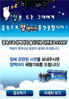 [아시아경제 이현주 기자]롯데헬스원은 '꿈속으로 양백마리' 출시기념 온라인 이벤트를 다음달 9일까지 진행한다고 26일 밝혔다.'꿈속으로 양백마리'는 수면제가 아닌 일반혼합음료로 경증 수면 장애를 가진 일반인들에게 효과가 있다.이번 온라인 이벤트는 게시판에 사연을 올리면 30명을 추첨해 제품을 증정하는 방식으로 진행되며, 당첨자는 8월 10일 홈페이지에 공지된다.롯데헬스원 관계자는 "수면제와 같은 의약품은 부담스러워하는 소비자들이 많아 가볍게 마실 수 있는 드링크제를 개발했다"며 "최근 열대야로 인해 잠 못들어 고민이라면 이번 이벤트 응모를 통해 양백마리를 마셔보는 것도 좋은 기회가 될 것"이라고 말했다.이현주 기자 ecolhj@<ⓒ세계를 보는 창 경제를 보는 눈, 아시아경제(www.asiae.co.kr) 무단전재 배포금지>