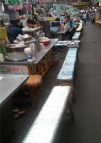 ▲ 광장시장 먹거리 골목의 모습. 손님용 의자가 텅 비어 있다.