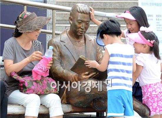 [아시아경제 정재훈 기자] 찌는 듯한 더위가 계속되는 가운데 31일 오후 한 시민이 종로구 세종문화회관 앞에서 책 읽는 동상에게 물을 권하고 있다.정재훈 사진기자 roze@<ⓒ세계를 보는 창 경제를 보는 눈, 아시아경제(www.asiae.co.kr) 무단전재 배포금지>