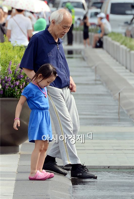 [아시아경제 정재훈 기자] 찌는 듯한 더위가 계속되는 가운데 31일 오후 손녀딸과 함께 종로구 광화문광장을 찾은 노인이 흐르는 물에 발을 대고 있다. 정재훈 사진기자 roze@<ⓒ세계를 보는 창 경제를 보는 눈, 아시아경제(www.asiae.co.kr) 무단전재 배포금지>