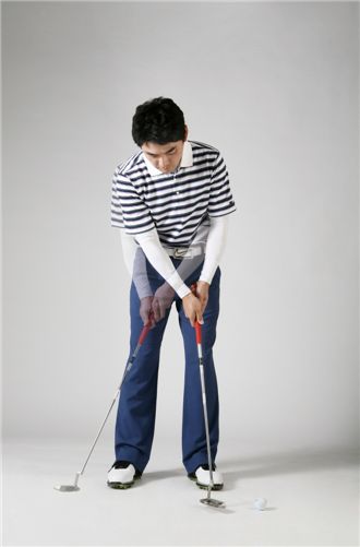 ▲ 퍼팅도 '원운동'= 가장 흔한 실수는 팔꿈치가 빠지는 현상이다. 백스윙에서 오른쪽, 다운스윙 때는 왼쪽 팔꿈치가 빠지는 식이다. 퍼터 헤드를 일직선으로 움직여야 한다는 강박 관념이 오히려 이상한 모양새를 만든 격이다. 주로 지면에 퍼터를 내려놓고 헤드의 중심이 샤프트를 따라 움직이는 연습을 많이 한 경우다. 드라이브 샷이나 아이언 샷과 마찬가지로 퍼팅 역시 척추를 중심으로 큰 원을 그리는 운동이다. 직선으로 움직이려고 하면 당연히 팔꿈치가 빠지는 비정상적인 몸동작이 만들어진다. 퍼팅처럼 짧은 거리를 보낼 때도 팔이 몸에서 떨어지면 클럽을 제어하기 어렵다. 팔꿈치가 자연스럽게 몸에 붙어서 움직여야 완만한 곡선을 그리면서 성공 확률도 높일 수 있다.[사진3] 이렇게 퍼팅해 보면 왼팔이 몸에서 떨어지는지 쉽게 알 수 있다.