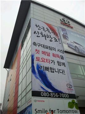 한국토요타 대구전시장이 지난주말 한국 올림픽 축구대표팀의 동메달 획득을 축하하는 플래카드를 내걸었다.