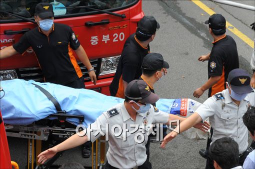 [아시아경제 윤동주 기자] 13일 서울 종로구 경복궁 근처 현대미술관 신축 공사현장에서 발생한 화재에서 사망한 한 근로자가 병원으로 옮겨지고 있다.윤동주 기자 doso7@<ⓒ세계를 보는 창 경제를 보는 눈, 아시아경제(www.asiae.co.kr) 무단전재 배포금지>