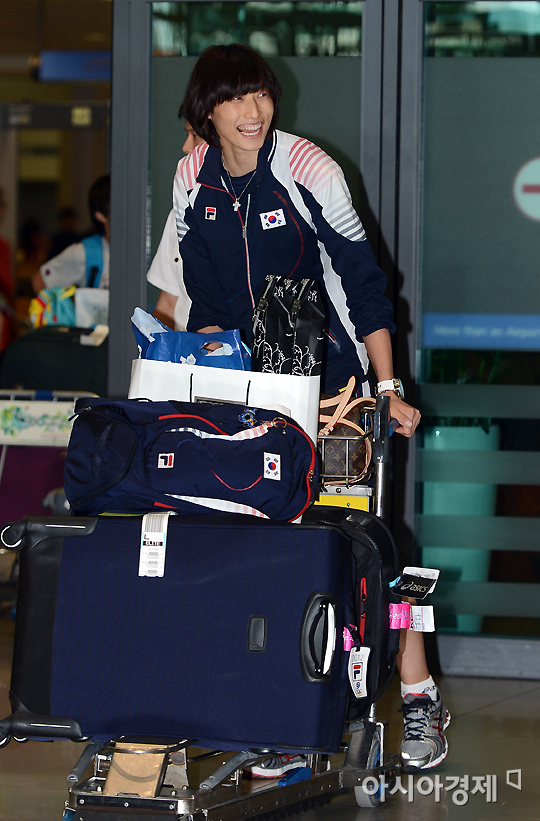 [인천=아시아경제 정재훈 기자] 2012 런던 올림픽에서 4위의 성적으로 선전한 여자배구 대표팀이 13일 오후 인천국제공항을 통해 귀국했다. 대회 MVP로 선정된 김연경이 밝게 웃으며 입국장으로 들어오고 있다.정재훈 사진기자 roze@<ⓒ세계를 보는 창 경제를 보는 눈, 아시아경제(www.asiae.co.kr) 무단전재 배포금지>정재훈 사진기자 roze@<ⓒ아시아 대표 석간 '아시아경제' (www.newsva.co.kr) 무단전재 배포금지>