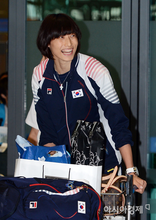 [인천=아시아경제 정재훈 기자] 2012 런던 올림픽에서 4위의 성적으로 선전한 여자배구 대표팀이 13일 오후 인천국제공항을 통해 귀국했다. 밝게 웃으며 입국장으로 들어서는 김연경.정재훈 사진기자 roze@<ⓒ세계를 보는 창 경제를 보는 눈, 아시아경제(www.asiae.co.kr) 무단전재 배포금지>정재훈 사진기자 roze@<ⓒ아시아 대표 석간 '아시아경제' (www.newsva.co.kr) 무단전재 배포금지>