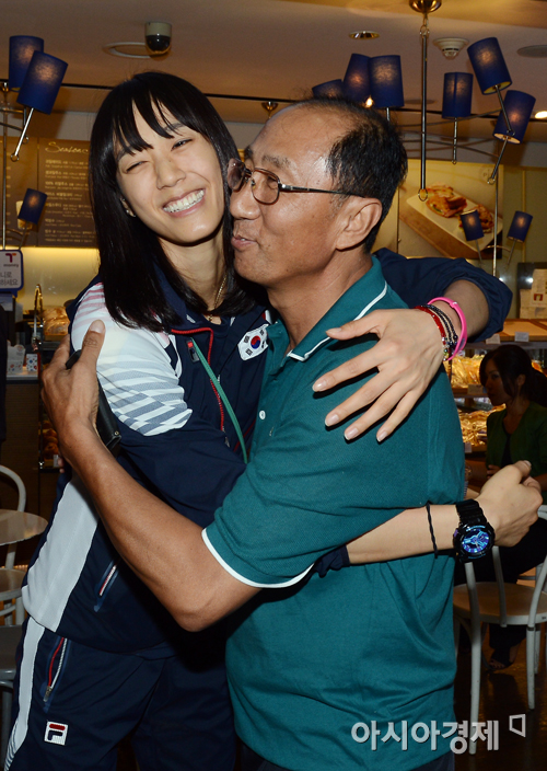 [인천=아시아경제 정재훈 기자] 2012 런던 올림픽에서 4위의 성적으로 선전한 여자배구 대표팀이 13일 오후 인천국제공항을 통해 귀국했다. 한송이가 공항에 마중나온 아버지와 포옹을 나누고 있다.정재훈 사진기자 roze@<ⓒ세계를 보는 창 경제를 보는 눈, 아시아경제(www.asiae.co.kr) 무단전재 배포금지>정재훈 사진기자 roze@<ⓒ아시아 대표 석간 '아시아경제' (www.newsva.co.kr) 무단전재 배포금지>