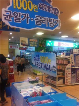▲서울역 롯데마트가 여행상품 1000원 균일가 코너로 매대를 설치해 치약, 샴푸 등과 함께 '콘돔'을 판매하고 있다.