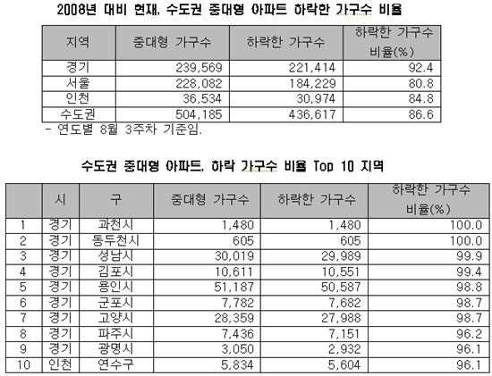 [아시아경제 박미주 기자]최근 제2금융권 일부가 중대형 주택에 대한 신규 대출 중단 등 대출관리 강화에 나선 이후 수도권 중대형 아파트 10채 중 8채의 집값이 하락한 것으로 나타났다.16일 부동산정보업체 부동산써브가 2008년 8월 대비 2012년 현재까지 수도권 아파트 315만4193가구(동일 아파트 대비)를 대상으로 전용면적 102㎡ 초과 중대형 아파트의 하락한 가구수를 조사한 결과, 10채 중 8채가 하락한 것으로 조사됐다.중대형 아파트는 중소형에 비해 가격 하락폭이 크고 실수요가 적어 매매도 잘 이뤄지지 않아 대부분 가구의 시세가 내린 것으로 분석된다. 중대형 가구수가 가장 많이 분포한 경기도는 23만9569가구 중 22만1414가구가 하락해 10채 중 9채 이상 집값이 내렸다. 인천은 3만6534가구 중 3만974가구가 하락해 10채 중 8채가 하향 조정됐다. 서울 역시 22만8082가구 중 18만4229가구의 시세가 내려 10채 중 8채가 내림세를 보였다.버블세븐 지역인 과천은 중대형 아파트 1480가구 모두 하락해 모든 가구가 집값 하락의 직격탄을 맞았다. 1기 신도시가 속한 성남시(분당), 김포시(일산), 군포시(산본), 고양시(일산) 등도 중대형 10채 중 9채 이상의 집값이 떨어지며 침체의 골이 깊었다. 박정욱 부동산써브 선임연구원은 "부동산 장기침체로 매수심리가 위축된 가운데 세금 부담과 대출 규제 등으로 중대형 아파트 선호도가 급격히 줄어들었다"며 "주택시장이 실수요자 위주로 재편되며 자금 부담이 큰 중대형의 매수세가 좀처럼 살아나기 힘든 탓에 수도권 중대형 아파트 침체는 당분간 지속될 것"이라고 내다봤다. 박미주 기자 beyond@<ⓒ세계를 보는 창 경제를 보는 눈, 아시아경제(www.asiae.co.kr) 무단전재 배포금지>