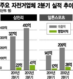 17일 업계에 따르면 삼천리자전거는 2분기 매출액 410억원, 영업이익 41억원을 기록하며 지난해 같은 기간 대비 각각 25%, 78% 성장했다. 이는 2분기 기준 사상 최대 실적으로, 상반기 중 영업이익도 처음으로 50억원을 넘어섰다. 지난 2007년 연간 영업이익이 50억원이었음을 감안하면 5년만에 이익 규모가 두 배로 뛴 셈이다. 당기순이익도 35억원을 기록, 지난해 같은 기간 대비 40% 증가했다. 삼천리자전거의 계열사로 첼로 등 고급자전거 유통을 맡고 있는 참좋은레저 역시 2분기 매출액과 영업이익이 185억원과 95억원으로 각각 지난해 같은 기간 대비 7%, 850% 증가했다. 당기순이익은 71억원으로 지난해 같은 기간(7억원)대비 무려 10배 증가했다. 국내 2위 자전거업체 알톤스포츠는 매출액 209억원, 영업이익 28억원을 기록하며 각각 지난해 같은 기간 대비 44%, 133% 증가했다. 당기순이익 역시 같은 기간 9억원에서 20억원으로 두 배 늘었다. 이처럼 자전거 업체들이 사상 최대급의 실적을 달성한 데는 계절적 특성도 있지만 국내 자전거 시장의 확대가 한몫했다는 분석이다. 삼천리 관계자는 "어릴 때 자전거를 타던 사람들이 현재 20-40대가 되어 자전거 시장에서 높은 구매력을 행사하고 있다"며 "구매 연령대가 높아지면서 중ㆍ고가 가격대의 자전거를 사는 구매층도 두터워졌다"고 말했다. 삼천리자전거에 따르면 중ㆍ고가 브랜드로 분류되는 '아팔란치아'의 경우 올 상반기 판매량이 지난해 같은 기간 대비 200% 증가했다. 최근 고유가 시대를 맞아 에너지를 절약할 수 있는 하이브리드 모델의 인기도 높았다. 삼천리자전거의 하이브리드 자전거인 '소울' 판매량은 전년 대비 300% 증가했고, 알톤 역시 하이브리드 모델의 매출액이 전체 매출액의 35%에 달했다. 업계 관계자는 "2분기가 일반적으로 자전거 업계의 성수기로 분류되지만, 중장년층의 자전거 타기가 늘면서 시장이 확대된 것이 매출 확대에 가장 주요하게 작용했다"며 "고급자전거에서 중급자전거로 주력모델이 이동했고, 4대강 사업으로 자전거 관련 인프라가 확대된 것도 시장 확대에 크게 기여했다"고 말했다. 이지은 기자 leezn@<ⓒ세계를 보는 창 경제를 보는 눈, 아시아경제(www.asiae.co.kr) 무단전재 배포금지>