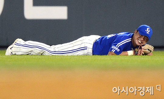 [아시아경제 정재훈 기자] 17일 오후 잠실야구장에서 열린 '2012 팔도 프로야구' 두산 베어스와 삼성 라이온즈의 경기 5회말 선두타자 이원석의 타구를 잡다 넘어진 박한이가 엎드려 웃고 있다.정재훈 기자 roze@<ⓒ세계를 보는 창 경제를 보는 눈, 아시아경제(www.asiae.co.kr) 무단전재 배포금지>