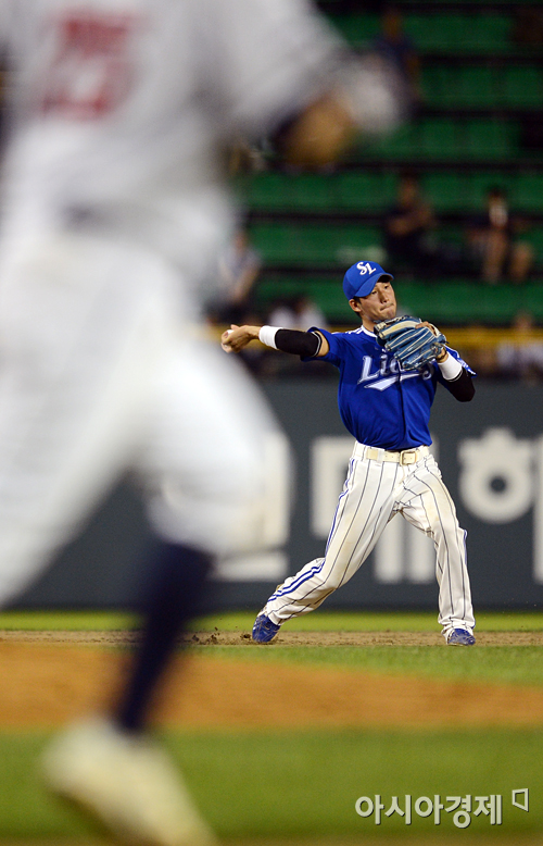 [아시아경제 정재훈 기자] 17일 오후 잠실야구장에서 열린 '2012 팔도 프로야구' 두산 베어스와 삼성 라이온즈의 경기 선두타자 양의지의 타구를 잡아 1루로 송구, 아웃시키는 김상수.정재훈 기자 roze@<ⓒ세계를 보는 창 경제를 보는 눈, 아시아경제(www.asiae.co.kr) 무단전재 배포금지>