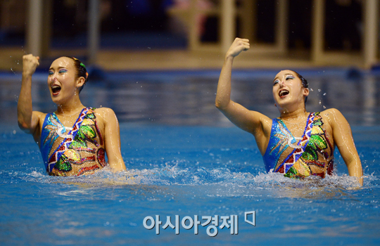 [아시아경제 정재훈 기자] 2012 런던 올림픽 싱크로 부문에서 12년만에 결승진출에 성공한 박현선-박현하가 18일 오후 올림픽수영장에서 열린 2012 K-water 사장배 전국 마스터스수영대회 개회식에서 듀엣 부문 시범을 선보이고 있다.정재훈 기자 roze@<ⓒ세계를 보는 창 경제를 보는 눈, 아시아경제(www.asiae.co.kr) 무단전재 배포금지>