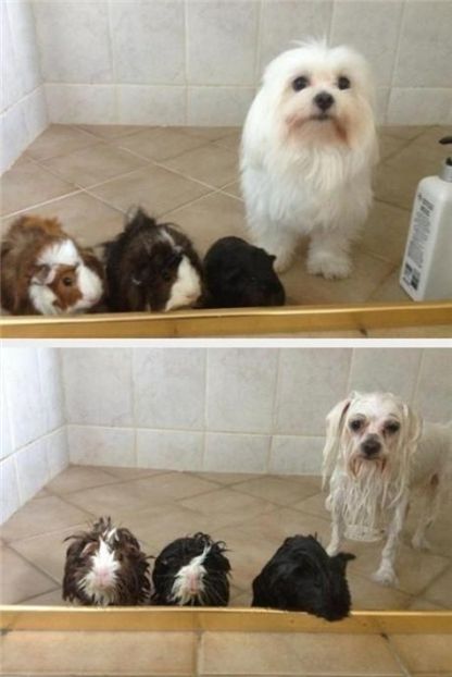 [아시아경제 온라인이슈팀] 애완동물의 샤워 전 후 모습을 비교한 사진 게시물이 네티즌들 사이에 화제다.최근 한 온라인 커뮤니티 게시판에는 '애완동물 샤워 전 후'라는 제목으로 두 장의 사진이 올라왔다. 이 사진에는 강아지 한 마리와 기니피그 세 마리의 샤워하기 전과 후의 모습이 나란히 담겨 있다. 샤워 전 뽀송뽀송하고 풍성하던 털은 샤워 후 물에 젖어 볼품없는 모양새로 돌변했다. 앙상해 보이는 것은 물론 늙은 인상마저 주고 있다.사진을 본 네티즌들은 "너무 귀엽다", "머릿발이 사라졌네", "물에 빠진 생쥐 꼴" 등 다양한 반응을 보였다. 온라인이슈팀 <ⓒ세계를 보는 창 경제를 보는 눈, 아시아경제(www.asiae.co.kr) 무단전재 배포금지>