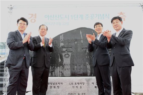 [아시아경제 박미주 기자]22일 천안아산역 동측 광장에서 열린 '아산신도시 1단계 준공기념식'에서 준공 제막식을 마치고 이지송 LH 사장(좌측 두번째)과 복기왕 아산시장(좌측 첫번째), 안희정 충남도시자(우측 두번째), 오세진 LH 아산직할사업단장(우측 첫번째)이 기념비 앞에서 기념촬영을 하고 있다.박미주 기자 beyond@<ⓒ세계를 보는 창 경제를 보는 눈, 아시아경제(www.asiae.co.kr) 무단전재 배포금지>