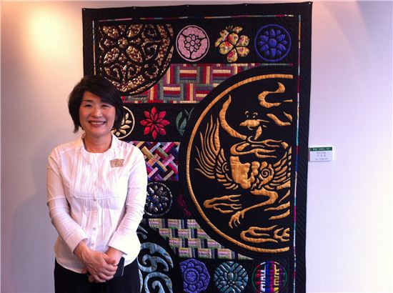 윤혜경씨가 제자 이정림씨의 퀼트 작품 '떡살 그리고, 나!'를 설명한 후 포즈를 취하고 있는 모습.