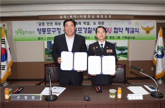 조길형 영등포구청장(왼쪽)과 김두연 영등포경찰서장이 24일 ‘공원 안전 확보 및 5대 폭력 척결’을 위한 MOU를 맺었다. <br />