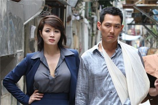 Kim Hye-soo (left) and Lee Jung-jae (right) pose together during the shooting of "The Thieves," opened in theaters on July 25, 2012. [Showbox]