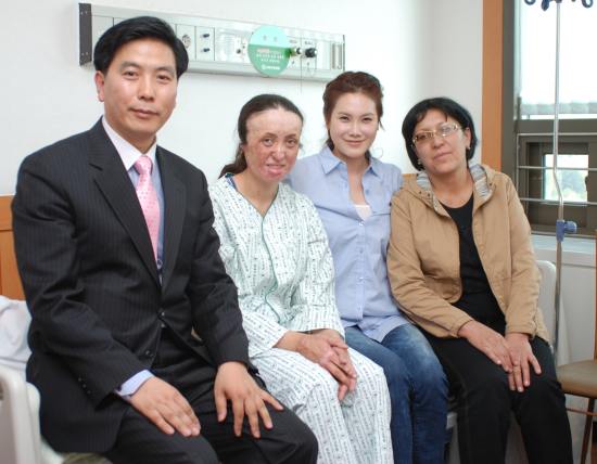 우즈베키스탄 우미다씨가 건양대병원에서 화상재건수술을 받기 전 모습. 왼쪽부터 현수동 목사, 우미다씨, 가수 김현정, 우미다씨 어머니, 지난해 5월 KBS 사랑의 리퀘스트 출연 모습.