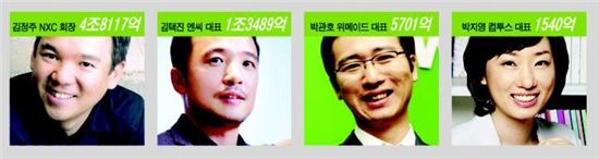 [아시아경제 조유진 기자]셧다운제 시행 등 정부 규제에 따른 업황 악화속에서도 게임사 오너들의 주식 자산은 크게 증가한 것으로 나타났다. 29일 업계에 따르면 넥슨 창립주인 김정주 NXC(넥슨 지주사) 회장의 주식 자산은 4조8117억원(28일 종가 기준)이다. 지난해 12월 일본 도쿄증권거래소 1부에 넥슨을 상장할 당시 김 회장의 자산은 2조원대로 그새 시세 차익을 두배 이상 낸 것이다. 지배 구조 강화와 엔씨소프트 인수로 그 영향력은 더욱 커질 것으로 업계는 보고 있다. 증권업계 한 관계자에 따르면 넥슨이 그동안 인수한 JCE, 게임하이, 네오플 등 개발사들의 주식가치까지 더했을 경우 김 대표의 주식가치는 웬만한 재벌가 주식 부호들을 넘어선다는 평가다. 업계 6위의 위메이드엔터테인먼트의 창립주 박관호 대표는 1년 사이 지분 가치가 200% 증가했다. 박 대표가 보유한 주식 총액은 1895억원에서 5701억원으로 늘었다. 1년 사이 3배 가까이 올랐던 주가는 최근 크게 빠졌지만 카카오와의 제휴로 다시 힘을 내고 있는 상황이다. 국내 최대 모바일 게임사 컴투스의 박지영 대표의 보유 주식 총액도 1년 사이 353% 증가했다. 컴투스의 주가 상승의 영향으로 박 대표의 지분 가치는 지난해 9월 383억원에서 1540억원(28일 종가 기준)으로 급등했다. 1년 사이 1157억원이 늘어난 것이다. 한 달 평균 96억4000만원이 증가한 셈이다. 반면 지분 매각과 주가하락으로 주식 자산이 크게 줄어든 사례도 있다. 김택진 엔씨소프트 대표는 넥슨에 지분 14.7%(약 8045억원)를 매각하며 최대주주 자리를 내줬다. 김 대표가 현재 보유한 지분 10.40%의 평가액은 5760억원에 이른다. 하지만 넥슨의 엔씨 인수 이후 주가가 꾸준히 하락해 지난 2개월 사이 시총이 3250억원 증발했다. 이에 따라 김 대표의 주식 자산도 소폭 축소됐다. 네오위즈(네오위즈게임즈 지주사)의 나성균 대표는 최대 실적을 달성에도 불구하고 주가 하락으로 자산이 축소됐다. 지난해 1조 자산가에 이름을 올린 나 대표는 1년 사이 주식가치가 9003억원에서 2892억원으로 줄었다. 네오위즈게임즈는 개발사와의 상표권 분쟁, 피파온라인3 계약 불발 등 여러 악재가 잇따르면서 주가가 지난해 10월 고점(7만4700원) 대비 3분의 1토막이 났다. 네오위즈게임즈의 시가총액은 같은 기간 1조30613억원에서 5259억원으로 급감했다.업계 관계자는 "장기화된 경기침체 속에서도 게임주가 호실적을 보이면서 지난 1년 사이 업계 오너들의 주식 자산이 크게 늘었다"며 "게임산업은 전통적으로 불황에 강한 성장 산업인데다가 넥슨을 필두로 국내 게임사들이 성장 모멘템을 해외 시장에서 찾으면서 기업 가치가 높아지는 상황"이라고 설명했다. 조유진 기자 tint@<ⓒ세계를 보는 창 경제를 보는 눈, 아시아경제(www.asiae.co.kr) 무단전재 배포금지>
