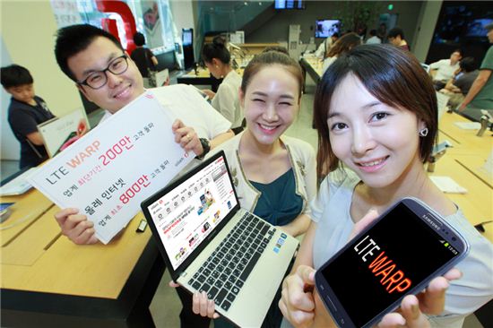 [아시아경제 김철현 기자]KT의 유무선 통신 서비스 사용자 증가세가 속도를 내고 있다. KT(회장 이석채)는 업계 최단 기간에 롱텀에볼루션(LTE) 가입자 200만 명을 돌파했다고 30일 밝혔다. 초고속인터넷 가입자도 800만 명을 넘어섰다.KT는 경쟁사보다 6개월 가량 늦은 올 1월 LTE 서비스를 시작해 지난 6월 초 5개월 만에 가입자 100만 명을 유치했고 가입자 증가세가 속도를 내면서 8개월 만에 200만 명 고지에 올라섰다.LTE 월간 가입자 수를 살펴보면 84개 시 전국망 서비스 개시 전인 지난 4월 약 23만 명 수준이었으나, 8월에는 약 48만 명으로 2배 증가했고 하루 평균 가입자도 1만8000 명으로 늘었다. KT 관계자는 "3G를 포함한 전체 판매량 중 최근 LTE 판매 비중이 80%를 초과해 급성장 중"이라고 설명했다.KT의 초고속인터넷 서비스인 '올레 인터넷'도 1999년 서비스 시작 후 13년 만에 가입자 800만 명을 돌파했다. 이는 우리나라 전체 인터넷 가입자 1800만 가운데 약 44%에 해당하는 수치다.