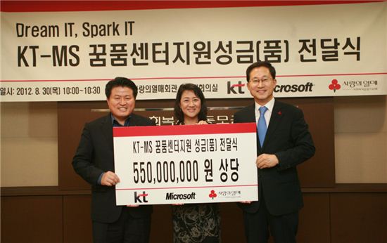 KT와 한국마이크로소프트가 30일 서울 중구 정동 사랑의 열매 회관에서 'KT-MS 꿈품 센터 지원 성금전달식'을 진행하고 있다. 왼쪽부터 최재근 KT홍보실 전무, 박선정 MS 대표변호사, 김주현 공동모금회 사무총장.