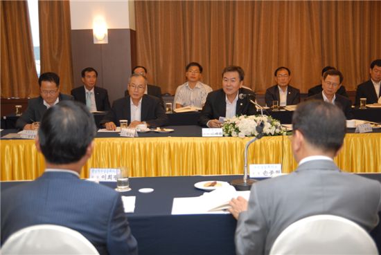 신제윤 기획재정부 차관을 만난 대전-충청권 기업인들이 지역경제의 어려움을 호소하고 있다.(정면 가운데가 신 차관)