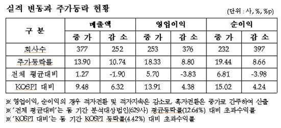 [아시아경제 오현길 기자]12월 결산법인 가운데 일부 기업들이 상반기 실적 저조에도 불구하고 주가는 상승한 것으로 집계됐다.3일 한국거래소 유가증권시장본부와 한국상장회사협의회가 12월 결산법인 가운데 지난해와 실적비교가 가능한 법인 629개사의 상반기 실적과 주가 현황을 조사한 결과, 상반기에 영업이익이 줄어든 376개사의 주가가 8월말 현재 연초대비 8.80%나 상승했다.이 기간 코스피 상승률이 4.42%인 점을 감안하면, 4.38%의 초과수익률을 기록했다.아울러 같은 기간 영업이익이 증가한 253개사의 주가는 18.33%나 증가했다.또 매출액이 증가한 377개사의 주가는 13.90%나 뛰었으며, 매출액이 감소한 252개사도 10.74%에 달하는 주가상승률을 기록했다.특히 실적이 개선된 기업들은 코스피 보다 높은 주가상승률을 보였다. 매출액이 증가한 377개사의 주가는 코스피 등락률 대비 13.90%나 상승했으며, 영업이익이 늘어난 253개사의 주가도 18.33% 올랐다.매출액 증가율 상위 기업으로는 이엔쓰리가 상반기 86억원을 달성해 전년동기 대비 1105.14% 증가했으며, 주가는 28.57%나 증가했다. 로엔케이는 매출액이 전년대비 349.92% 오른 35억원을 기록했고 주가는 242.22%나 올랐다.하이트진로홀딩스는 상반기 매출액 2305억원으로 전년대비 306.50% 증가했으나 주가는 5.58% 감소했다.영업이익 증가율 상위 기업으로는 IHQ가 19억원으로 전년대비 16846.68% 증가했지만 주가는 39.32% 줄어들었다. 이어 KISCO홀딩스가 영업익 86억원으로 전년비 3930.26% 늘었고, 주가는 7.12% 올랐다.오현길 기자 ohk0414@<ⓒ세계를 보는 창 경제를 보는 눈, 아시아경제(www.asiae.co.kr) 무단전재 배포금지>