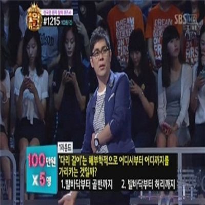 다리길이는 도대체 어디까지를 말하는 것일까.지난 31일 방송된 SBS '세대공감 1억 퀴즈쇼'에서는 올림픽 영웅특집 편으로 체조 양학선 선수와 펜싱 최병철, 신아람 선수가 패널로 참여해 스타상금 300만원에 도전했다. 이날 방송에서는 1라운드 100만원 문제로 '다리 길이는 해부학적으로 어디서부터 어디까지를 가리키는 것일까?'가 나왔다. 보기에는 1번 발바닥부터 골반까지, 2번 발바닥부터 허리까지가 주어졌다. 최병철 선수는 "평소 옷입는 것에 관심이 많은데, 다리 길이 잴 때 보면 골반까지 재더라"면서 1번을 택한 이유를 설명했다. 이 문제의 정답은 1번 발바닥부터 골반까지가 정답이었다. 이날 방송은 올림픽 영웅특집 편으로 체조 양학선 선수와 펜싱 최병철, 신아람 선수가 패널로 참여해 스타상금 300만원에 도전했다.전슬기 기자 sgjun@<ⓒ세계를 보는 창 경제를 보는 눈, 아시아경제(www.asiae.co.kr) 무단전재 배포금지>