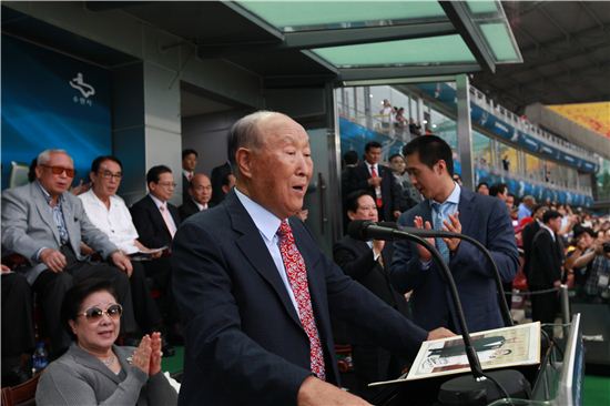지난 7월 문선명 통일교 총재가 수원 피스컵 축구대회에서 개회 선언을 하는 모습.
