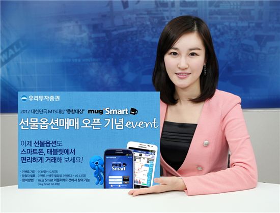 [아시아경제 전필수 기자]우리투자증권이 3일 스마트폰 주식매매 어플리케이션인 머그 스마트(mug Smart)에 선물옵션 매매 기능 오픈을 기념해 오는 10월5일까지 이벤트를 실시한다고 밝혔다. 머그 스마트, 머그 스마트 탭(mug Smart Tab) 어플리케이션을 실행해 이벤트 팝업창을 통해 간단히 OX퀴즈에 응모하거나 이벤트 기간 중 1회 이상 선물옵션을 매매한 고객을 대상으로 스타벅스 커피, 백화점 상품권 등 푸짐한 경품을 증정한다.머그 스마트 선물옵션 매매 서비스는 시세, 잔고, 차트 기능 제공은 물론 선물옵션 투자자 매매동향과 실시간 변동량, 프로그램 매매정보, 미결제 약정 차트 등을 제공한다. 호가영역 터치만으로 연결되는 주문 기능, 모든 차트의 가로 보기, 멀티차트, 선물옵션 퀵메뉴 구성 등의 고객 편의 기능에 중점을 뒀다. 새로운 기능들로 업그레이드된 머그 스마트는 안드로이드폰은 플레이스토어에서, 아이폰은 앱스토어에서 어플리케이션 설치 혹은 업데이트 후 사용하면 된다.