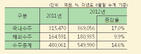 [아시아경제 진희정 기자]대형건설사들의 상반기 수주실적이 전년 동기대비 14.6% 증가했다. 국내외 모두 수주영업이 호조세를 보인 영향이다. 하지만 국내경기 불황과 해외시장에서의 출혈경쟁 등으로 경영위기 가능성을 배제하기 어려운 상황이라는 평가가 지배적이다.3일 건설경영협회는 현대건설과 삼성물산 등 대형 30개사의 국내 수주실적이 공공부문의 재정조기 집행과 민간부문의 자체공사 확대 등에 힘입어 전년 대비 17% 증가했다고 밝혔다. 해외에서도 연초의 수주부진 우려를 떨쳐내고 9.9% 증가세를 시현했다고 덧붙였다. 수주규모는 총 54조9990억원으로 지난해 48조원 대비 14.6% 늘었다.