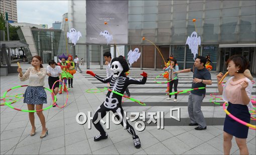 [아시아경제 윤동주 기자] 에버랜드는 가을 축제 '할로윈&호러나이트'를 앞두고 4일 서울 중구 태평로 삼성생명 광장에서 유령의상을 차려입은 연기자들과 시민들이 막대형 스낵 '피노스틱'을 입에 물고 훌라후프 돌리기 대결을 펼치는 이벤트를 진행하고 있다.윤동주 기자 doso7@<ⓒ세계를 보는 창 경제를 보는 눈, 아시아경제(www.asiae.co.kr) 무단전재 배포금지>