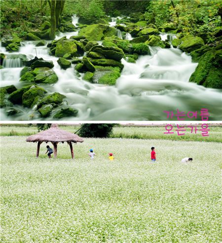 9월의 시작, 평창은 지금 여름과 가을이 공존하고 있다. 성성하게 녹색빛을 토해내는 장전리 이끼계곡(사진 위)은 아직 한여름의 모습을 그대로 가진하고 있고, 순백색 메밀꽃이 장관을 이룬 봉평들녘은 가을내음으로 진동하고 있다.