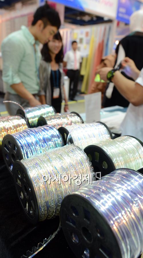 [아시아경제 정재훈 기자] 5일 서울 삼성동 코엑스에서 열린 대한민국섬유교역전을 찾은 관람객들이 전시장을 둘러보고 있다. 사진은 빛의 각도에 따라 색깔이 변하는 카멜레온 섬유.정재훈 기자 roze@<ⓒ세계를 보는 창 경제를 보는 눈, 아시아경제(www.asiae.co.kr) 무단전재 배포금지>