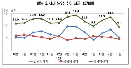[아시아경제 김유리 기자]지난달 회사채 발행규모가 9조4000억원에 그치면서 3개월 만에 10조원대 아래로 떨어졌다. 전통적 발행비수기인 데다 직전달 대규모 발행이 이뤄지면서 수요가 줄어들었기 때문으로 분석됐다. 6일 한국예탁결제원에 따르면 지난달 회사채 전체발행규모는 9조4845억원으로 직전달 13조6256억원 대비 30.4% 감소했다. 지난해 같은기간 10조9844억원에 비해서는 13.7% 감소한 수치다. 상환액은 7조1912억원으로 2조 2933억원 순발행을 기록했다. 7월 3조1428억원 순발행 대비 순발행규모는 줄었지만 3개월 연속 순발행을 나타냈다. 예탁결제원 관계자는 "8월 회사채 발행시장은 저금리 기조로 발행회사에게 유리한 발행여건이 갖춰졌음에도 불구하고 7월 선제적 발행에 따른 발행수요 감소 및 전통적 발행비수기 등의 영향으로 부진한 모습을 보였다"고 설명했다. 휴가시즌으로 인한 전통적 발행비수기인 데다, 한국은행 기준금리 인하 및 하반기 경기불확실성을 대비해 7월 회사채 발행이 대규모로 이뤄져 8월 회사채 발행이 7월 대비 30.4% 감소했다는 설명이다. 다만 저금리기조로 인해 투자자들이 상대적으로 금리가 높은 5년 이상 장기물에 관심을 가지게 되면서, 우량기업을 중심으로 한 장기물 발행은 증가하는 경향을 보였다.일반회사채 발행규모는 5조445억원으로 7월 8조4485억원 대비 40.3% 감소했다. 지난해 같은기간 5조984억원과 비교하면 1.1% 감소했다. 상환액은 3조6875억원으로 1조3570억원 순발행이 이뤄졌다. 7월에 이어 순발행 기조를 유지했으나 규모는 감소했다. 유동화SPC채의 발행규모는 1조4382억원으로 7월 6837억원 대비 110.4% 증가했으며, 주요 유동화 기초자산은 통신 및 건설 프로젝트파이낸싱(PF) 관련 채권으로 분석됐다. 지방공사채의 발행금액은 1911억원으로 7월 1조6356억원 대비 88.3% 줄었다. 상환금액은 4217억원으로 7월 7898억원 대비 46.6% 감소했다. 발행목적별 발행규모는 운영자금이 3조2660억원으로 가장 많았고 만기상환을 위한 차환발행(1조237억원), 시설자금(642억원), 용지보상(111억원) 순이었다. 기타 목적으로도 6795억원이 발행됐다. 회사별 발행규모는 롯데쇼핑(7800억원), S-Oil(5000억원), SK텔레콤(4000억원)순이었다. 상위 10개사의 발행금액(3조600억원)은 전체 일반회사채 발행액의 60.7%를 차지했다.지난달 금융회사채의 발행규모는 4조4400억원으로 직전달 5조1771억원 대비 14.2% 감소했다. 지난해 같은 기간 5조8860억원에 비해서는 24.6% 줄었다. 상환액은 3조5037억원으로 9363억원 순발행을 기록했다. 7월 1조6489억원 순상환에서 순발행으로 전환했다.회사별 발행규모는 신한은행이 7000억원으로 가장 많았고, 국민은행(3700억원), 우리은행(3000억원), 현대캐피탈(3000억원) 등이 뒤따랐다. 상위 5개사의 발행금액(1조9200억원)이 전체 금융회사채 발행금액에서 차지하는 비율은 43.2%였다.김유리 기자 yr61@<ⓒ세계를 보는 창 경제를 보는 눈, 아시아경제(www.asiae.co.kr) 무단전재 배포금지>