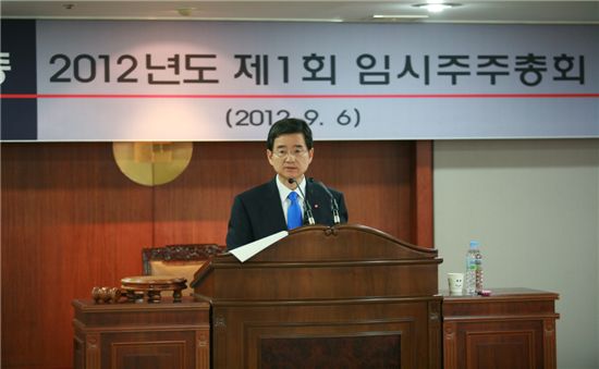 ▲6일 열린 대한주택보증 2012년도 제1회 임시주주총회에서 김선규 사장이 인사말을 하고 있다.