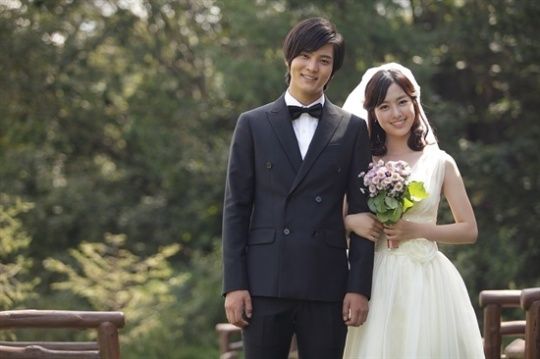 Actor Joo Won (left) and Jin Se-yeon (right) link arms as the two pose for their wedding photo during the final episode of "Bridal Mask," which aired on September 6, 2012. [KBS]