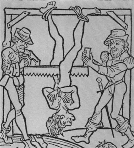 ◆ 톱질형(Sawing) = 고대 로마 3대 황제(제위 37∼41) 칼리굴라 즉위 당시 행해졌던 형벌이다. 죄인을 거꾸로 매달아 놓고 큰 톱으로 반토막을 낸다. 사타구니에 칼을 넣어 머리까지 반으로 쪼갠다. 톱은 마지막에 두개골을 통과하기 때문에 죄인은 엄청난 양의 피를 쏟아내면서도 살아있는 채로 고통을 느끼게 된다. 폭군 칼리굴라는 형장에서 식사를 하면서 이를 지켜봤다고 전해진다. 후에 아시아에서 비슷한 형이 생겼는데 서양의 톱질형과는 다르게 직립 상태에서 머리부터 사타구니까지 자르는 방식이었다.