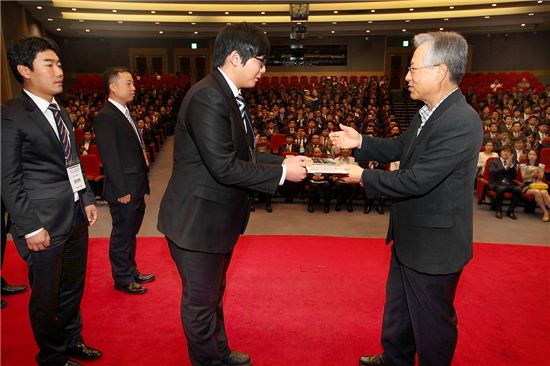 이석채 KT 회장이 '2012년 KT 고객서비스직 입문교육 수료식'에 참석해 신입사원 정성훈 매니저에게 수료증을 수여하고 있다.