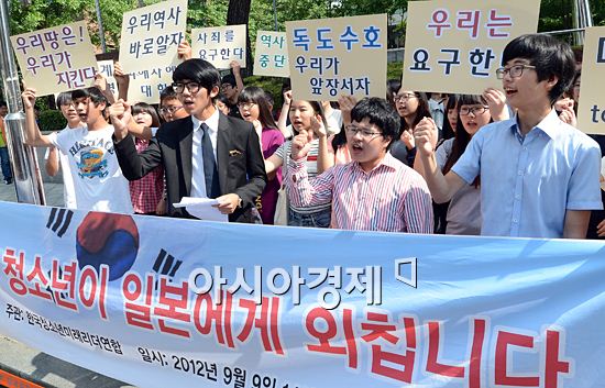 [아시아경제 정재훈 기자] 한국청소년미래리더연합이 9일 오후 일본대사관 앞에서 '독도의, 독도에 의한, 독도를 위한 청소년들의 외침' 기자회견을 갖고 일본의 영유권 주장 철회와 일본군 위안부 문제 사과 등을 요구했다.정재훈 기자 roze@<ⓒ세계를 보는 창 경제를 보는 눈, 아시아경제(www.asiae.co.kr) 무단전재 배포금지>