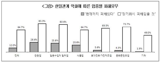 [아시아경제 임선태 기자]#1. "한·일갈등이 발생한 광복절 이후 지난달 말까지 한국여행을 취소한 일본인 단체관광객만 300명에 육박. 9월 하순부터 시작되는 일본의 수학여행 특수가 실종될까 더 걱정이다." <국내 3대 여행업체 A사 사장>#2. "일본의 반한(反韓) 정서를 의식해 동남아시아나 중국쪽으로 발길을 돌리는 국내여행객 때문에 걱정이 앞선다." <국내 여행업체 B사 관계자>#3. "지난달부터 내방객이 30% 감소했다. 실제 계약도 절반 이하로 뚝 떨어졌다. 2005년 다케시마의 날 제정, 2006년 일본교과서 독도표기 때처럼 주위의 눈총 때문에 일본차 구입을 주저하는 분위기 때문이다." <일본차 국내판매사 C사 관계자>#4. "일본 주문업체의 납품연기 요청으로 일본 현지 매출이 3분의 1로 급감했다. 현 추세라면 올해 주문량은 작년의 절반에도 못 미칠 것으로 예상된다. 국내 유명 아이돌가수를 활용한 현지 마케팅도 최근 취소한 상태다." <흑초 제조 식품업체 D사 관계자>이명박 대통령의 독도 방문 후 한·일 관계 악화에 따른 실제 피해 사례다. 국내 기업 10곳 중 1곳 꼴이다. 갈등 상황이 지속될 경우 국내 기업 10곳 중 6곳은 추가 피해가 불가피할 것으로 조사됐다. 특히 90% 이상의 기업이 별 다른 대응책이 없는 것으로 나타나 정부 차원의 대응책 마련이 시급한 것으로 나타났다. 11일 대한상공회의소(회장 손경식)가 대일(對日) 거래기업 500개사를 대상으로 실시한 '최근 한일관계 변화의 산업계 영향과 대응과제 조사' 결과에 따르면 응답 기업 중 12%는 "한일관계 악화로 교역차질과 매출감소 등의 피해를 이미 입었다"고 답했다. 가장 큰 피해를 입은 업종은 관광업(26.8%)으로 나타났다. 뒤를 이어 일본수입차 딜러업(25.8%), 식품업(20.6%), 휴대전화·가전제조업(5.6%), 문화콘텐츠업(4.3%) 순이다.