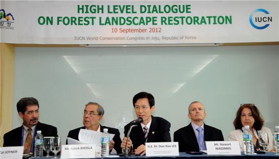 제주에서 열린 '산림경관복구를 위한 고위급회의'에서 세계 산림경관복구 필요성을 역설하는 이돈구(가운데) 산림청장. 왼쪽은 아쇽 코슬러 IUCN 총재.<br />