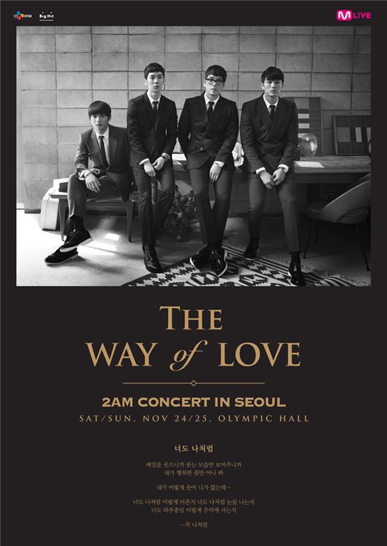 2AM members Jinwoon (left), Jo Kwon (second to left), Changmin (second to right) and Seulong (right) in dark-colored suits pose in the official poster of the Seoul leg for their Asia tour “2AM CONCERT IN ASIA ‘The Way of Love,’” to be held at the Olympic Hall in Seoul, Sout Korea on November 24 and 25, 2012. [CJ E&M]