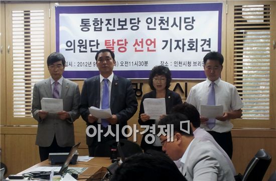 13일 기자회견을 열어 탈당을 선언하고 있는 인천지역 시의원과 구의원들. /사진=노승환 기자 todif77@