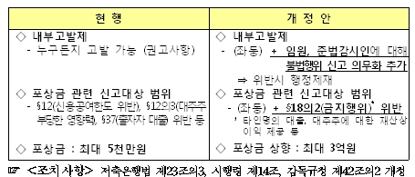 [아시아경제 김현정 기자] 금융당국이 저축은행 내부비리고발제 활성화를 위해, 고발자를 금융감독원 상담원으로 채용하는 방안을 내놨다. 현행 제도상 포상금이 낮고, 보복인사를 당할 위험성이 있어 효과적으로 시행되지 않고 있다는 판단에 따른 것이다. 13일 금융위원회는 '저축은행 건전경영을 위한 추가 제도개선 방안'을 발표, 지배구조 투명성 강화의 일환으로 내부고발제 활성화를 추진한다며 이 같이 밝혔다. 금융위는 내부고발 후 해당 저축은행의 자체 보복인사 등으로 퇴직당한 직원에 대해 향후 금감원 전문상담원 또는 저축은행중앙회 직원 등으로 지원할 경우 채용우대 혜택을 준다는 방침이다. 포상금은 최대 3억까지 지급된다. 또한 최근 5년 간 비리 행위로 적발돼 수사기관에 통보된 대주주 및 경영진 등 비리 전력자 명단을 데이터베이스(DB) 형태로 구축, 관리를 강화한다. 이밖에 신고 편의성을 높이기 위해 온라인 신고센터를 열고, 향후 각 저축은행 홈페이지에도 관련 페이지를 링크시킬 예정이다. 김현정 기자 alphag@<ⓒ세계를 보는 창 경제를 보는 눈, 아시아경제(www.asiae.co.kr) 무단전재 배포금지>