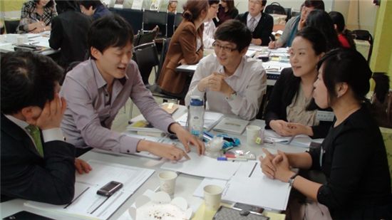 ◆책읽기의 즐거움을 되찾자=돌파구를 찾기 위해 동화세상에듀코는 독서경영시스템을 완전히 뜯어고치는 작업에 착수했다. 김영철 대표이사의 주문은 간단했다. "직원들이 책을 좋아하게 만들어라". 김 대표는 "다만 자신이 읽은 책을 정리하고, 자신의 것으로 소화할 수 있는 능력을 키워줘야 한다"고 덧붙였다. 김운송 마케팅ㆍHRD 팀장은 "책을 좋아하는 직원들은 다양한 지원을 반길지 몰라도 1년에 책을 한권도 보지 않는 직원들은 책을 사준다고 해도 부담스러워한다"며 "오히려 책을 더 싫어하게 될 위험성도 크다"고 지적했다. 이 같은 문제를 해결하기 위해 새로운 독서경영의 방향은 '어떻게 하면 책을 싫어하는 직원들도 책을 좋아하고, 즐길 수 있도록 도와줄까?' 로 설정됐다. 이런 기본적인 방향에 따라 동화세상에듀코는 2010년 교보문고독서교육연구소와 손잡고 전 직원들을 위한 '독서경영리더과정'을 개발했다. 물고기를 잡아주기보다 물고기 잡는 법을 가르치자는 의도였다. 이에 따라 독서경영리더과정은 다양한 독서법과 정리법, 토론법을 체계적으로 배울 수 있도록 설계했다. 김 팀장은 "우선 책에 어떻게 접근하는지 알려주고, 읽은 내용을 정리하는 방법과 다른 사람들과 공유하는 방법 등을 8주에 걸쳐 배우게 된다"고 말했다. 첫해에만 100명이 독서경영리더과정을 이수했으며, 내년까지 전 사원이 과정을 이수할 계획이다.동화세상에듀코의 '독서리더양성과정' 교육 장면
