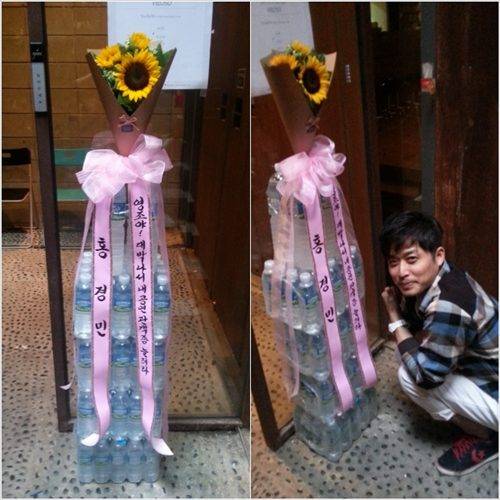 [아시아경제 온라인이슈팀] 가수 홍경민(36)이 생수로 만든 화환을 선물해 화제다.홍경민은 지난 15일 홍대 벨로주에서 열린 가수 '폴라로이드피아노'의 콘서트장에 생수를 쌓고 그 위에 해바라기꽃을 달아 장식한 화환을 보냈다.'폴라로이드피아노'는 연주자와 작곡가로 활동해온 뮤지션 임영조의 원맨 프로젝트(작곡에서 노래까지 혼자 전 과정을 진행하는) 밴드다. 홍경민이 보낸 화환에는 "영조야! 대박 나서 내 공연 관객 좀 늘려라"라는 문구가 적혀있다. 생수로 화환을 만든 이유는 임영조가 지난 8월 '생수에게'란 타이틀로 첫 싱글 앨범을 발표했기 때문이다.사진을 본 네티즌들은 "재치가 넘치시네요", "웬 생수인가 했다", "대박나세요" 등의 반응을 보였다.한편 홍경민의 15주년 기념 콘서트 '락앤댄스'는 다음달 6일과 7일 양일간 서울 용산구 블루스퀘어 삼성카드홀에서 열릴 예정이다.온라인이슈팀 <ⓒ세계를 보는 창 경제를 보는 눈, 아시아경제(www.asiae.co.kr) 무단전재 배포금지>