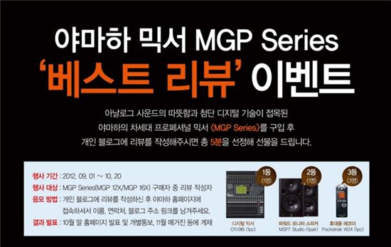 [아시아경제 이정민 기자] 음향기기전문기업 야마하뮤직코리아(대표 후쿠토메 히토시)는 18일 아날로그 믹서 ‘MGP시리즈’의 ‘베스트 리뷰’이벤트를 진행한다고 밝혔다. 이번 이벤트는 다음달 20일까지 진행되며, 개인 블로그에 ‘MGP시리즈’의 사용후기를 작성한 후 야마하뮤직코리아 홈페이지(//kr.yamaha.com)의 이벤트란에 간단한 개인정보와 블로그 주소만 입력하면 누구나 응모가 가능하다.1등 당첨자에게는 390만원 상당의 야마하 디지털믹서 ‘01V96i’(1명), 2등에게는 180만원 상당의 야마하파워드 모니터 스피커 ‘MSP7 Studio’(1명), 3등에게는 60만원 상당의 야마하 휴대용 레코더 ‘Pocketrak W24’(3명)가 사은품으로 증정된다.후쿠토메 히토시 야마하뮤직코리아 대표는 “야마하 믹서가 만들어내는 최고급 사운드의 경험을 공유하고, 제품의 성능과 기능을 빠르고 쉽게 이해할 수 있는 기회를 마련하기 위해 이번 이벤트를 기획했다”고 말했다.이정민 기자 ljm1011@<ⓒ세계를 보는 창 경제를 보는 눈, 아시아경제(www.asiae.co.kr) 무단전재 배포금지>