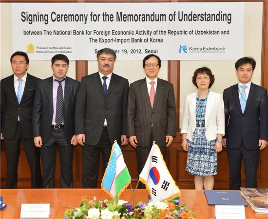 김용환 수출입은행장(사진 맨 왼쪽부터 네번째)과 사이다흐맛 라히모프(Mr. Saidakhmat Rakhimov) 우즈베키스탄 대외경제개발은행장(사진 맨 왼쪽부터 세번째)이 19일 여의도 수출입은행 본점에서 ‘한국 기업의 우즈베키스탄 프로젝트 지원을 위한 업무 협약’을 체결한 후 참석자들과 기념촬영을 하고 있다.