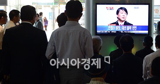 [아시아경제 정재훈 기자] 안철수 서울대학교 융합과학기술대학원 원장이 18대 대선 출마를 공식 선언한 19일 오후 서울역에 설치된 TV 앞에서 시민들이 걸음을 멈추고 안철수 원장의 선거 출마 선언을 지켜보고 있다. 정재훈 기자 roze@<ⓒ세계를 보는 창 경제를 보는 눈, 아시아경제(www.asiae.co.kr) 무단전재 배포금지>